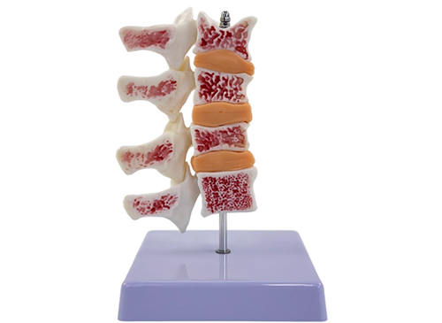 XY-134脊椎典型病变模型(骨质疏松模型)由4块切开的腰椎组成,显示正常的腰椎及其骨结构,轻度骨质疏松症,腰椎有一些变形,严重的骨质疏松症,腰椎已明显变形,呈扁平状。