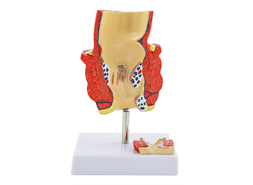 XY-403A痔疮模型为直肠的前段,实物大小,用来为展示痔疮的病理,除了显示直肠的一些解剖结构(肛门括约肌、粘膜、静脉血管网)外,还表现了1期和2期的内痔以及外痔,另外底板上的小模型展示的是3期和4期的痔疮。